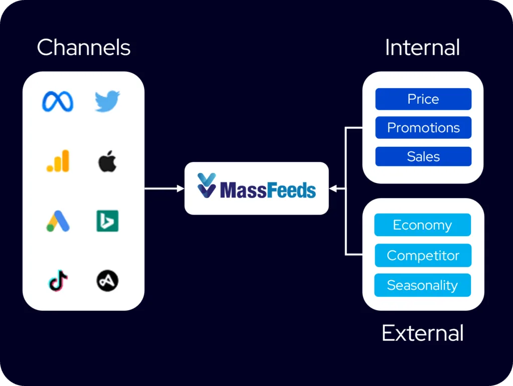 MassFeeds is the specialised data preparation software in the MASS Analytics Suite. It accelerates Marketing Mix Modeling (MMM) projects by automatically cleaning, structuring, and preparing data from multiple sources and formats, so your models are always ready for analysis.