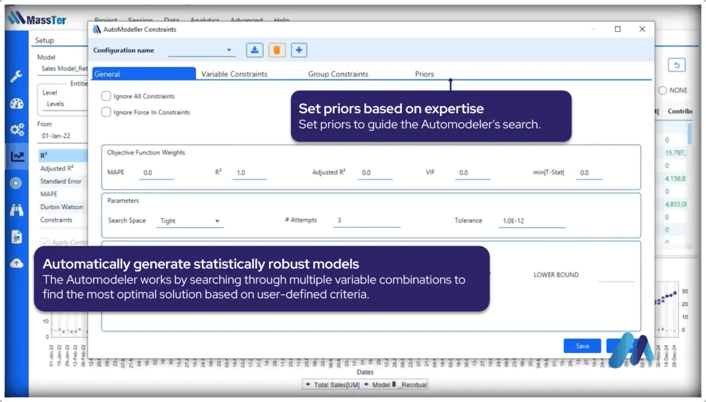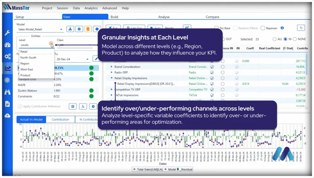 MassTer is the core of the MASS Analytics Software Suite, designed to help businesses measure and understand the drivers of marketing performance. It provides an intuitive, end-to-end platform for building, validating, and optimising Marketing Mix Models, empowering you to make confident, data-driven decisions.
